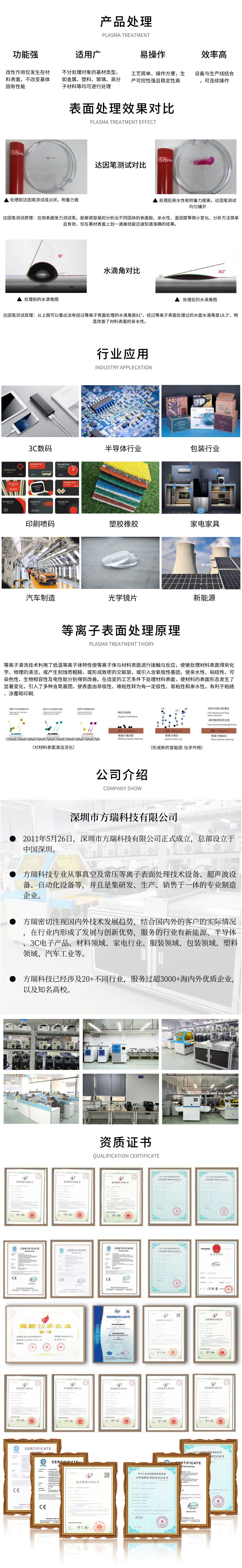 型号 FR-L235 控制系统 触摸屏+PLC 输入电压 AC220V(±10v) 电源功率 330W 设备柜体尺寸 880(L)×610(W)×1060(H)mm 处理宽度 235mm(可根据需求定做) 传送速度 0-600mm/min 频率 13.56MHz 重量 60KG 可调高度 0-70mm 使用气体 氩气/氧气